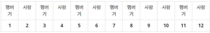 기다란 벤치 모양의 식탁에 사람들과 햄버거가 아래와 같이 단위 간격으로 놓여 있다. 사람들은 자신의 위치에서 거리가 $K$ 이하인 햄버거를 먹을 수 있다. 햄버거 사람 햄버거 사람 햄버거 사