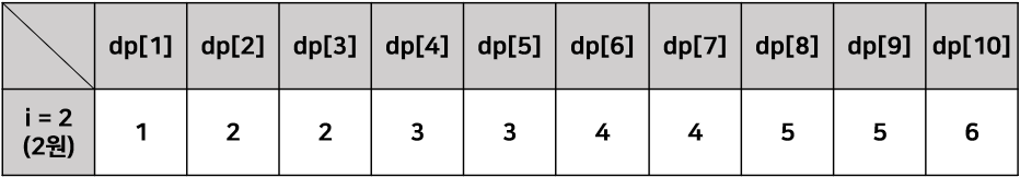 이후에는 1원과 2원을 이용한 경우의 수를 구한다. 앞서 저장된 dp의 값에서 누적하여 더하면 된다. 예를 들면, 1원일 때는 2원이 들어갈 수 없으므로 그대로 1, 2원일때는 1+1, 2 해서 2가지, 3원일 때는 1+1+1, 1+2해서 2가지 ... k만큼 구하면 된다.