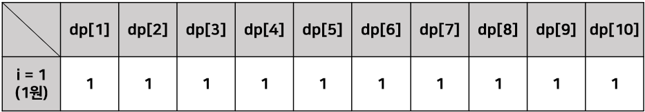 문제에 있는 예시를 이용해 차근차근 구해보자. 우선 첫번째 코인인 1원만을 이용해 dp를 구한다. 1원만을 이용하면, 1일때는 1, 2일 때는 1+1, 3일 때는 1+1+1, k일 때는 1+1+...+1(k개) 이런식으로 경우의 수는 1개씩 나올 것이다. 그럼 이를 이용해 표를 채워준다.