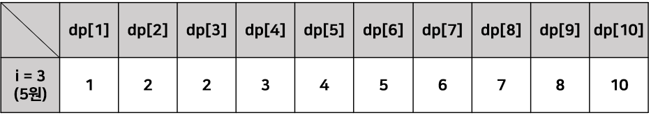 앞서 정리한 내용을 토대로 점화식이 dp[j] = dp[j] + dp[j - coin[i]]임을 도출해낼 수 있다. j는 coin[i]부터 K까지의 수를 for문으로 돌린 것이며, i는 현재 코인 값이다. 마지막으로 i=3인 5원까지 사용했을 때 경우의 수를 누적하여 합산한다. 앞서 저장된 dp[1]~dp[4]까지는 5원을 사용하지 못하므로, 숫자는 고정된다. dp[5]부터는 앞서 저장한 누적합에서 경우의 수를 구해 더하면 끝이다. 이 또한 점화식을 이용해 구하면 동일한 것을 확인할 수 있다.