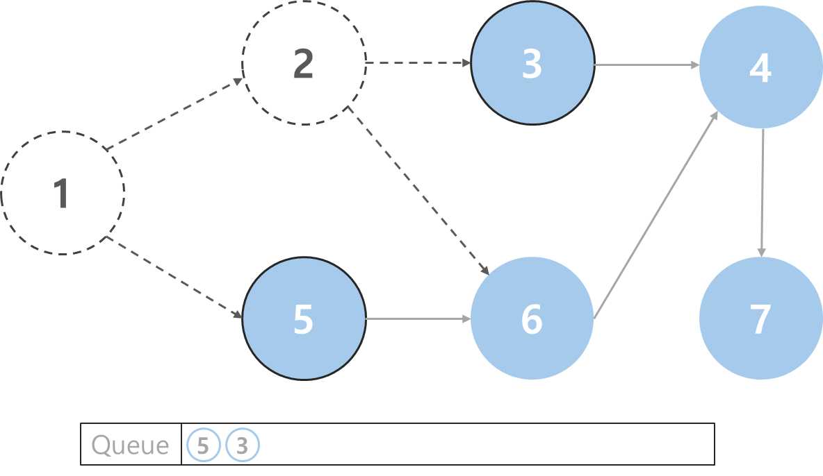 큐에서 노드 5를 꺼낸 후, 노드 5에서 나가는 간선을 삭제한다. 그리고 진입 차수가 0인 노드를 다시 큐에 삽입한다.
