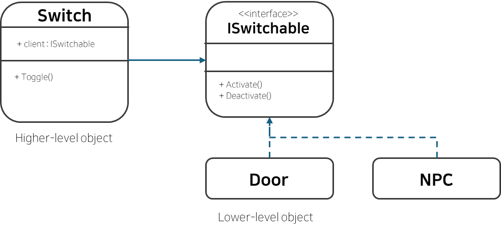 ISwitchable로 따로 분리시켜 Door는 이를 상속받아 구현을 해주면 된다. 만약에 Door가 아닌 NPC나 기믹이 존재한다면 Switchable을 상속받아 구현해주면 된다. 여기서 Switch 입장에서는 인터페이스를 가져와 Activate, Deactivate를 호출해주면 된다. 그렇게 되면 Switch 입장에서는 Door가 되든 기믹이 되든 상관이 없어진다. 이렇게 되면 확장에도 용이하다.
