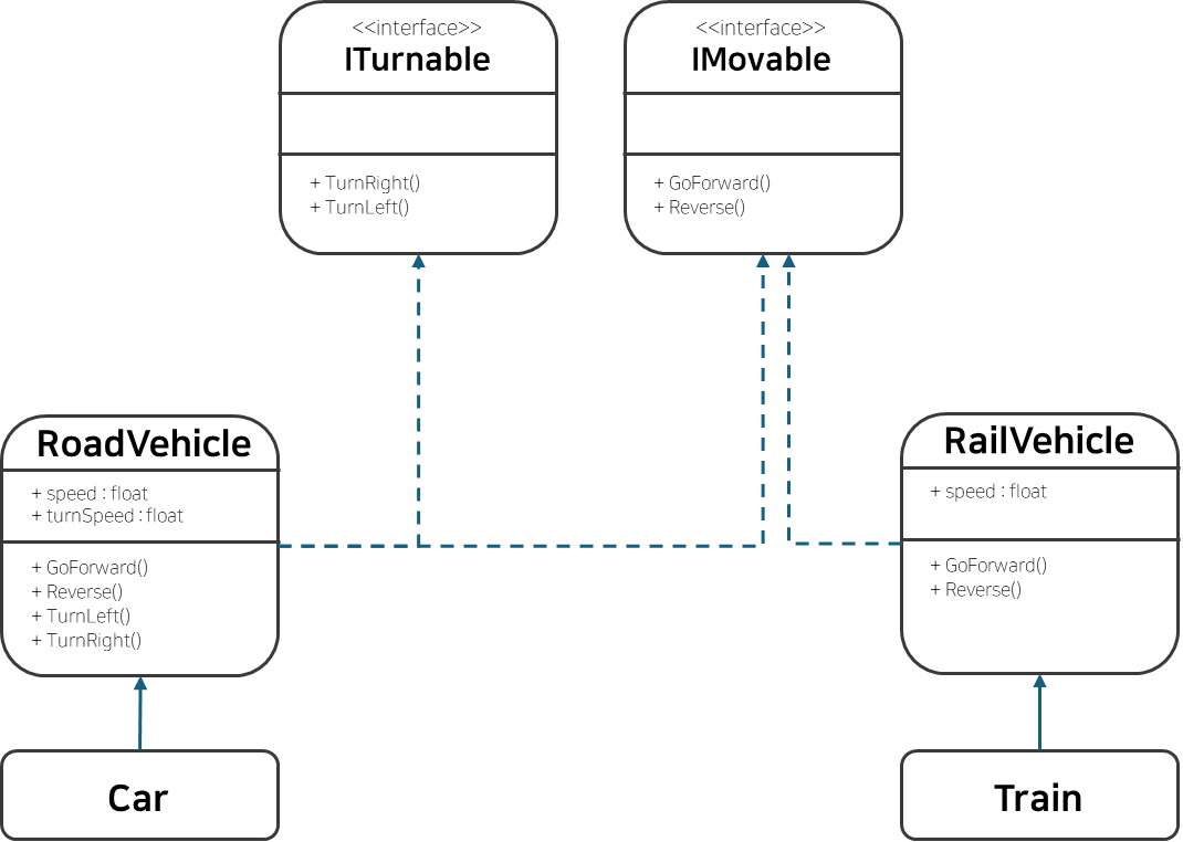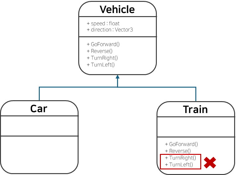 Turn의 여부, 움직임의 여부 등 인터페이스를 분리하고 이를 조합하여 상속받는 것이 좋다. 원칙에 위배되지 않고, 추후 다른 탈것들이 추가로 존재하면 이 인터페이스를 조합하여 상속받아 사용하면 조금 더 확장에는 유용하다고 할 수 있다. "is-a" 관계보다는 "has-a" 관계 개념을 이용하는 것이다.