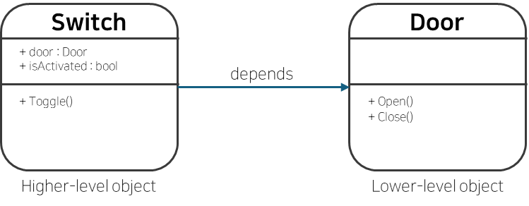 스위치를 눌러서 문을 열고 닫는 코드이다. 해당 코드의 문제점은 Door에 있는 함수를 직접적으로 호출함으로써 의존성이 발생하고 있다. 의존 역전 원칙은 상위 오브젝트와 하위 오브젝트는 의존하면 안되고 추상에 의존해야 한다. 따라서 의존 역전 원에 위배된다.
