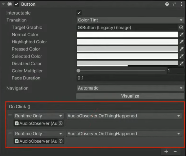 - UnityEvent : 이벤트를 관리하기 위해 Unity에서 제공하는 클래스이고, Unity의 인스펙터를 지원. 쉽게 설정하고 연결할 수 있는 이벤트 시스템이므로 비프로그래머에게 유용하나, 쉽게 사용할 수 있다보니 사용처 제한됨