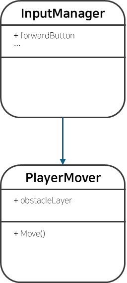 PlayerMover를 InputManager가 직접호출하지 않고 있으므로 강하게 참조하고 있지 않는다. 이를 코드로 구성하면 아래와 같다.