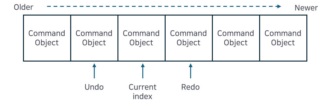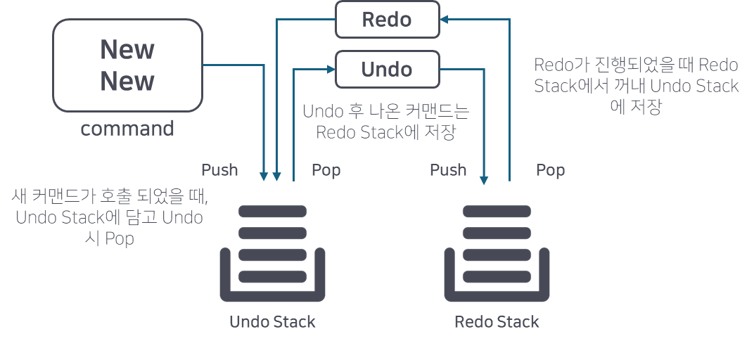 대략 그림처럼 커맨드가 호출되면 Stack에 담고 Undo 시 Stack에서 빠져나오는 코드를 예시에서 구현한다. 다만 유의해야 할 점은 Undo를 여러 번 진행했을 때, 새 커맨드를 진행해버리면 Redo는 다시할 수 없게 된다.