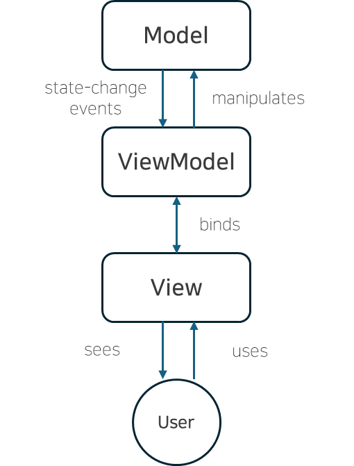 - ViewModel : Model과 View 사이에서 중재, 사용자가 View와 상호작용할 때 Model을 업데이트 하는 역할, Model이 변경될 때 View를 업데이트하는 로직도 포함, ViewModel과 View는 데이터 바인딩을 통해 연결