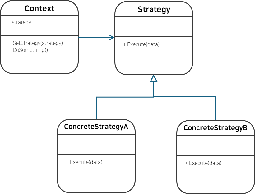그림을 살펴보면 베이스 클래스인 Strategy가 존재하고, 이를 구체화해서 만든 파생 클래스가 ConcreteStrategy 클래스들이다. 실시간으로 Context에서 A나 B를 자유롭게 변경할 수 있도록 만들어준다.