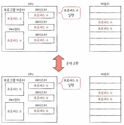 CPU는 한정되어 있으므로 돌아가면서 사용하기 위해 문맥 교환을 이용한다. 예를 하나 들어보면 A 프로세스가 B 프로세스로 순서가 넘어갈 때, A 프로세스는 지금까지 중간 정보(문맥)를 백업한다. 뒤이어 실행할 B 프로세스 문맥을 복구하면 자연스레 실행 중인 프로세스가 바뀐다. 이처럼 기존에 실행 중인 프로세스 문맥을 백업하고 새로운 프로세스 실행을 위해 문맥을 복구하는 과정을 문맥 교환이다.