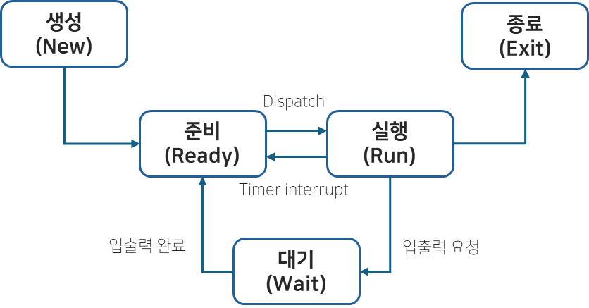 이때, 프로세스가 할당된 시간을 모두 사용(Time Interrupt)한다면 다시 준비 상태가 되며, 실행 도중 입출력장치를 사용해 입출력 장치 작업이 끝날 때까지 기다려야 하면 대기상태가 됨