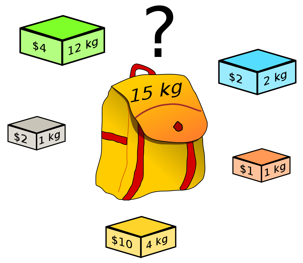 배낭 문제는 Dynamic Programming의 아주 대표적인 문제이다. 이는 조합 최적화의 문제이다. 간단하게 설명하자면 한 여행가가 지니고 있는 배낭에 담을 수 있는 무게의 최댓값이 정해져 있으며, 일정 가치와 무게가 있는 짐들을 배낭에 넣을 때 가치의 합이 최대가 되도록 짐을 고르는 방법을 찾는 문제이다.