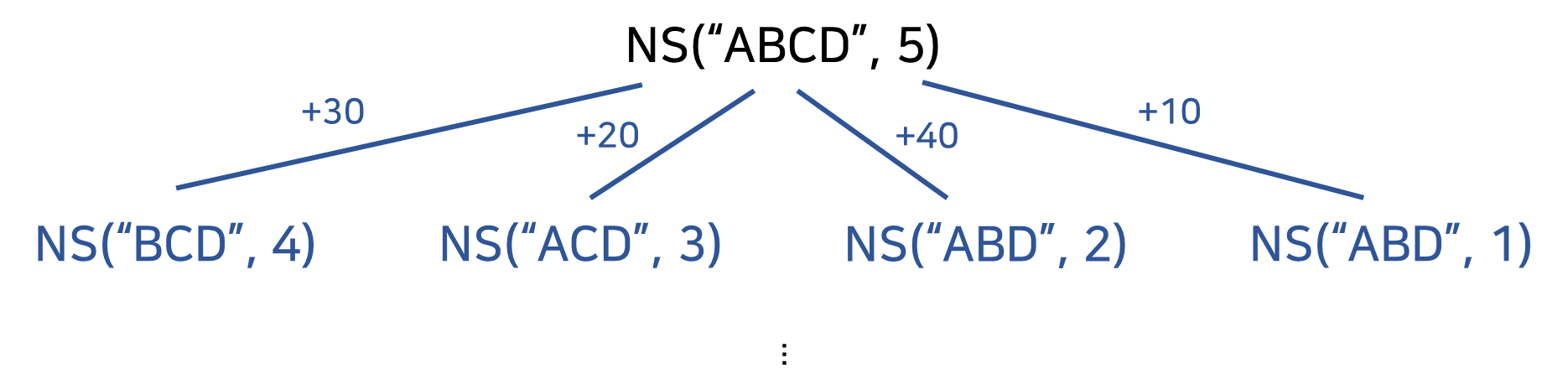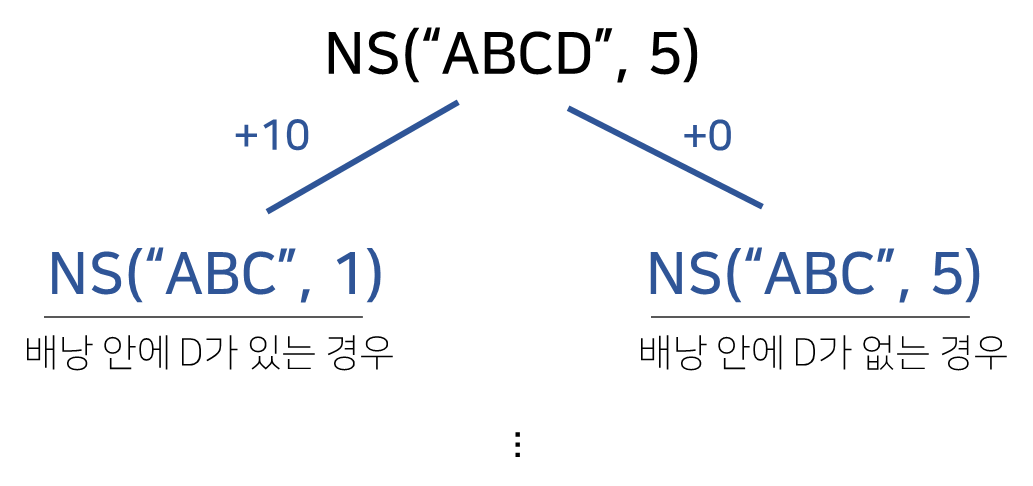 위의 방법처럼 sub-problem을 나눈 후에 max를 구하면 된다는 생각은 매우 잘못된 방법이다. 우리가 풀어야될 문제는 A,B,C,D 물건이 각각의 있는 경우와 없는 경우를 나누어야 한다는 것이다. 위의 sub-problem에서 problem으로 이동할 때 빠진 물건이 무조건 들어가게 되는 케이스로 나누고 있다. 즉, 위의 방식은 각각의 물건이 없을 경우가 정의되어 있지 않다.