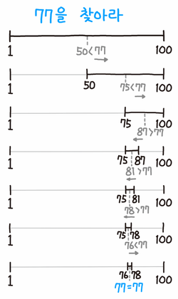 위의 예시를 살펴보자. 우선 50부터 탐색을 진행한다. 77은 50보다 크므로, 왼쪽 포인터를 오른쪽으로 이동한다. 그다음 절반인 75를 비교한다. 77은 75보다 크므로 왼쪽을 오른쪽으로 이동하면 된다. 다음은 87이며, 87은 77보다 작으므로 오른쪽 포인터를 왼쪽으로 이동한다. 이렇게 범위를 좁혀나가면 7번 이내에 무조건 숫자를 맞추게 된다.