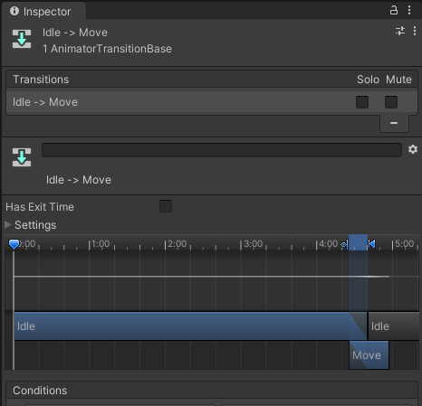 아마 프로그래밍을 하시는 분들은 bool 타입은 이미 다 알것이라 생각한다. 하지만 Unity를 잘 건들이지 못한 사람한텐 Trigger가 매우 생소할 것이라 예상한다. Trigger는 한번 실행되면 애니메이션이 종료된 후 다음 애니메이션으로 전환되는 것이다. 말그대로, 방아쇠를 한번 쏘고나면 끝이라는 소리이다. 여기서, 이렇게 애니메이션을 설정해도 움직일 때 애니메이션이 나오지 않는 경우가 있다. 화살표를 선택하면 Has Exit Time이 체크가 되어있을텐데, 이를 풀어줘야 빠르게 애니메이션을 전환할 수 있다.