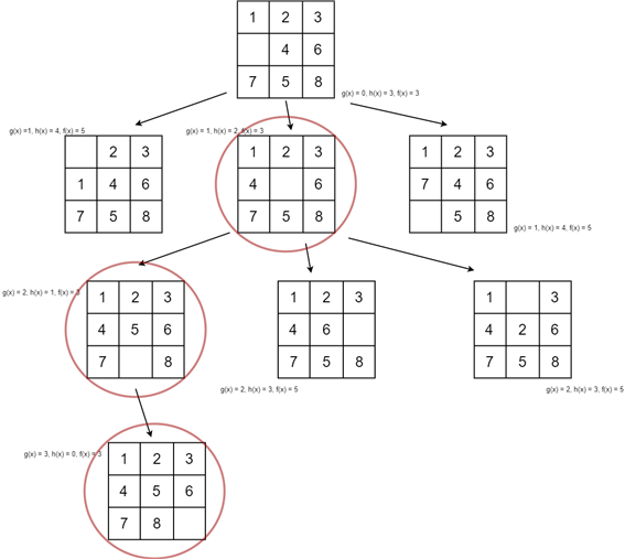 g(x)는 현재까지의 값, 퍼즐 게임 프로그램에서의 의미는 지금까지 움직인 횟수이다. h(x)는 앞으로 예상되는 값, 퍼즐 게임 프로그램에서는 최종 상태에 존재하지 않는 숫자들의 수로 생각하면 된다. 여기서 f(x)의 값이 작은 것부터 탐색한다.