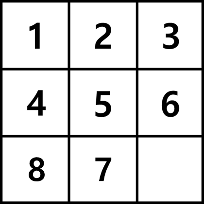 구현할 때 숫자를 랜덤 함수를 통해 무작위로 배치하면 불가능한 퍼즐이 나오는 경우가 있다. 3X3 타일을 예로 들자면 아래의 그림처럼 숫자가 배치되어 버리면 이 퍼즐은 최종 상태로 갈 수 없다. 따라서, 무작위가 아닌 다른 방법을 초기 상태를 고안해야 한다.