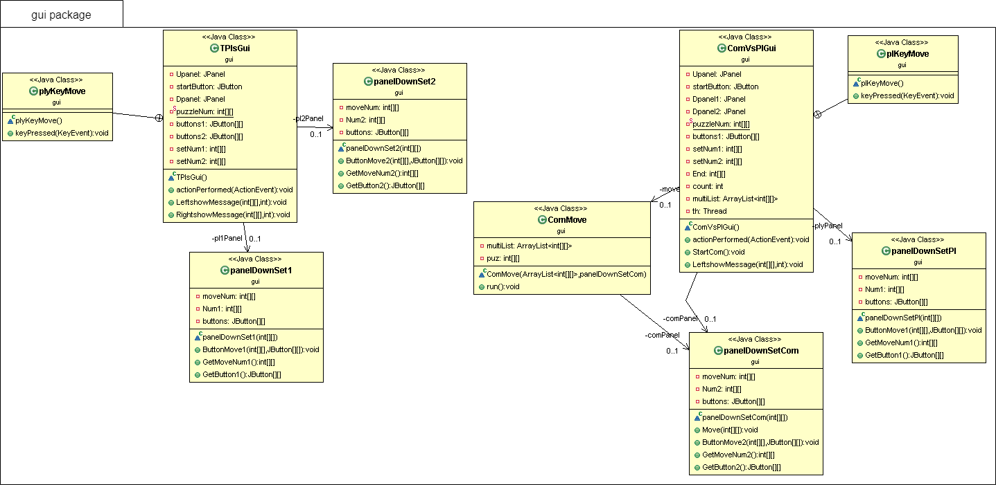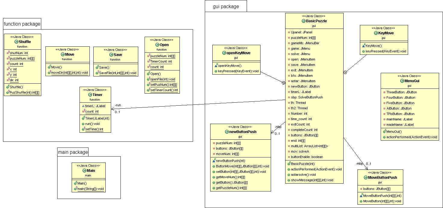 프로그램의 패키지 설계이다. 기본적으로 메인 함수에서 실행되면 모든 기능들이 구동된다. GUI 패키지는 각 퍼즐들의 화면을 구현하는 함수들이 모여있으며, function 패키지에는 각 퍼즐들의 기능이 구현되어 있다.